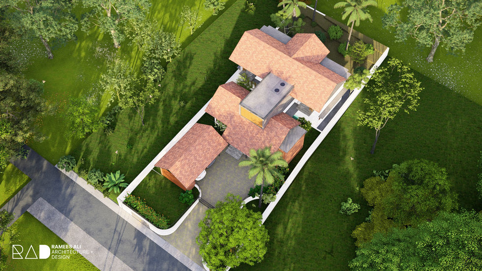 This tropical residence in Pattambi is a thoughtful response to climate, context, and culture. Designed with a sloping tiled roof and exposed brick jali screens, the house embraces traditional elements while maintaining a clean, modern aesthetic. The open and airy layout encourages cross ventilation and natural lighting, essential for the tropical climate.